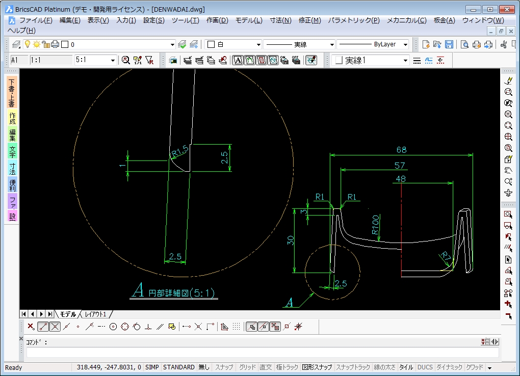 Bricscad(AutoCAD)作図では1図面尺度=1尺度が基本となります。そのため、作図画面(モデル空間)で作図し、出力画面(レイアウト空間)で異尺を表現する2つの画面で構成されております。